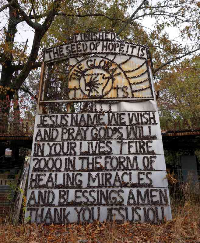 This welded environment was created by Robert Wells. His artwork and sculptures were made out of chain links, welded into words and sculptures. Prominently there is a massive prayer tablet made of welded chain that says, "FINISHED... THE SEED OF HOPE IT IS... PARTNERS IN PRAYER JESUS NAME WE WISH AND PRAY GOD'S WILL IN YOUR LIVES ✝ FIRE 2000 IN THE FORM OF HEALING MIRACLES AND BLESSINGS AMEN THANK YOU JESUS IOU."